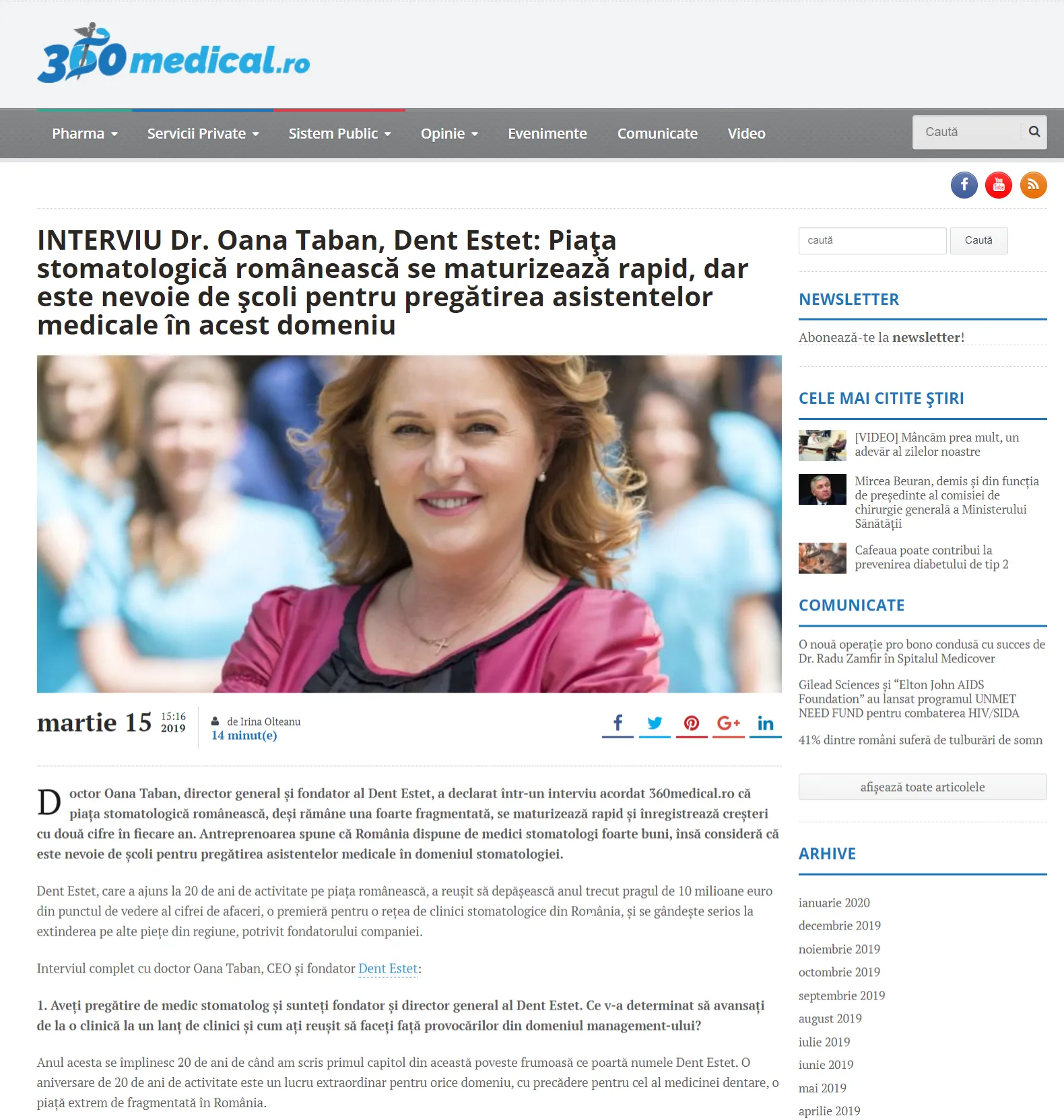 INTERVIU Dr. Oana Taban, Dent Estet: Piața stomatologică românească se maturizează rapid, dar este nevoie de școli pentru pregătirea asistentelor medicale în acest domeniu