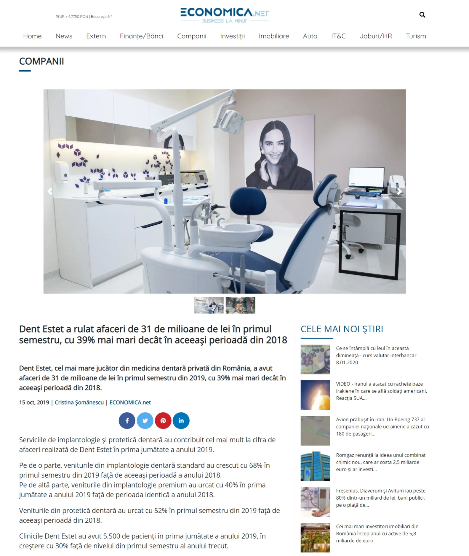 Dent Estet a rulat afaceri de 31 de milioane de lei în primul semestru, cu 39% mai mari decât în aceeaşi perioadă din 2018