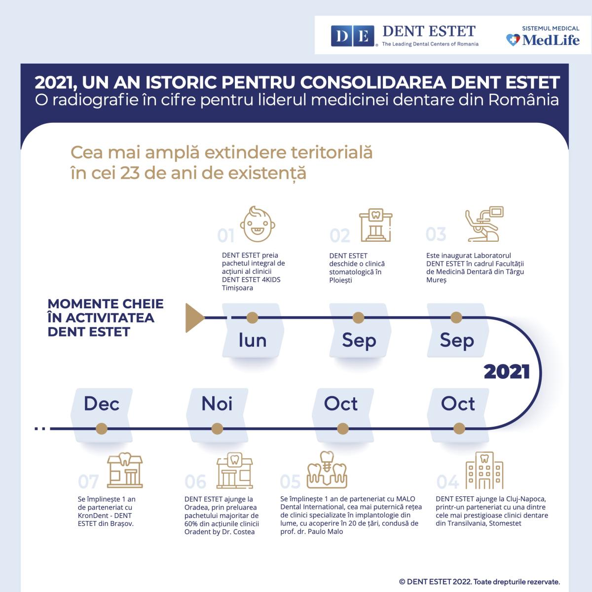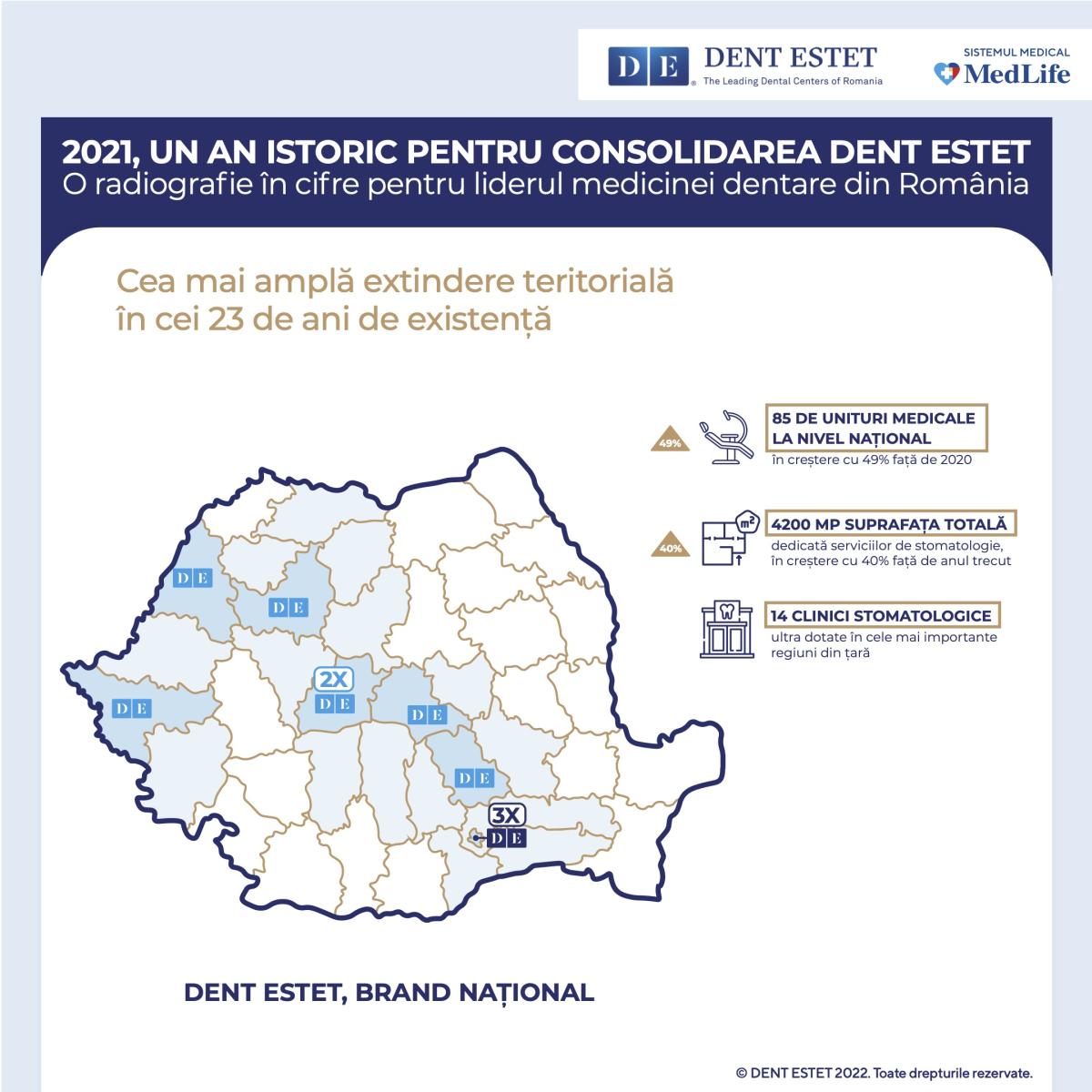 DENT ESTET, parte a Grupului MedLife și liderul pieței de medicină dentară din România, a avut în 2021 cea mai amplă extindere teritorială în cei 23 de ani de existență, mărindu-și portofoliul cu 3 clinici, în Ploiești, Cluj-Napoca și Oradea. Extinderea a vizat în special zona Transilvaniei, DENT ESTET semnând un parteneriat cu clinica Stomestet din Cluj și preluând pachetul majoritar al clinicii Oradent by Dr. Costea, din Oradea. O altă investiție în valoare de 1,7 milioane euro a fost alocată inaugurării în Ploiești a unei clinici premium cu servicii stomatologice all-in-one.