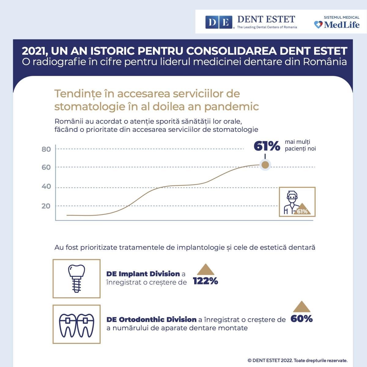 Datorită avansului tehnologic și a supraspecializării echipei din cadrul DENT ESTET Implant Division, românii și-au arătat încrederea în serviciile medicale, astfel că numărul total al implanturilor dentare inserate a crescut cu 122% în 2021 față de 2020. Creșterea masivă a cererii pentru implanturi dentare, dar și pentru alte tipuri de tratamente stomatologice relevă, totodată, faptul că pacientul român este din ce în ce mai preocupat de sănătatea sa dentară, chiar în contextul epidemiologic actual.