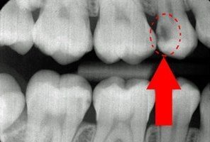 Caria dentară este reprezentată pe radiografie de o zonă gri spre negru prezentă pe suprafața dintelui. De asemenea, cariile pot ataca și dinți cu lucrări protetice chiar la joncțiunea dintre substanța naturală ș proteză.