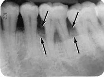 Resorbțiile osoase sunt reprezentate de coborârea sau urcarea liniei de os sub linia normală (limita dintre coroana dentară naturală și rădăcină), lăsând zone de rădăcină descoperite și înconjurate de suprafețe negre.