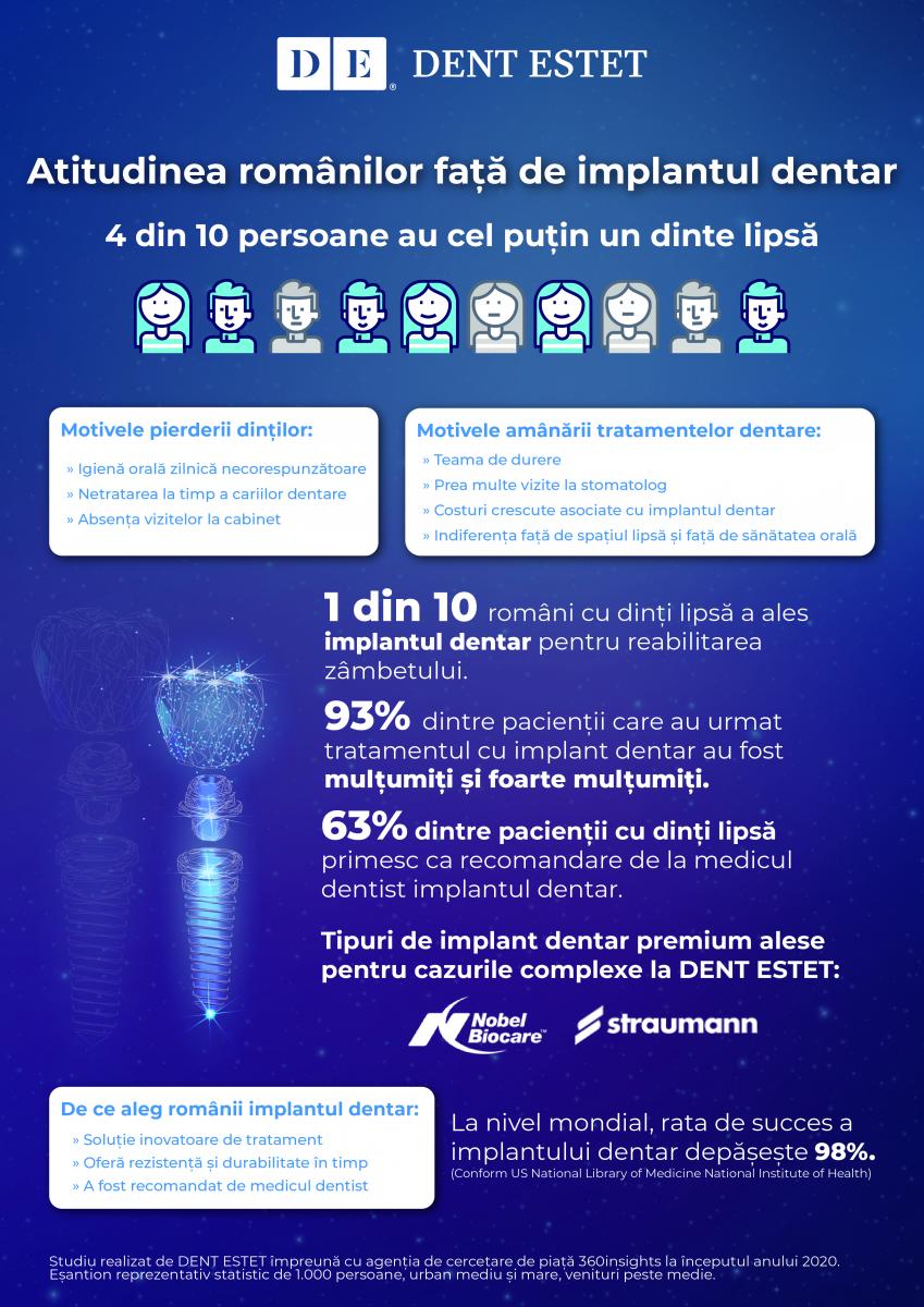 Rezultatele aparțin unui studiu derulat de DENT ESTET, liderul pieței de medicină dentară privată din România, cu sprijinul agenției de research 360insights, cu scopul de a fundamenta un program de educație dentară a populației și de a crește gradul de conștientizare privind importanța prevenției pentru minimizarea nevoii de tratamente stomatologice complexe. Studiul, realizat pe un eșantion reprezentativ statistic de 1.000 de persoane, la nivel urban mediu și mare din România, analizează atitudinile și comportamentul românilor din mediul urban cu privire la sănătatea dentară.